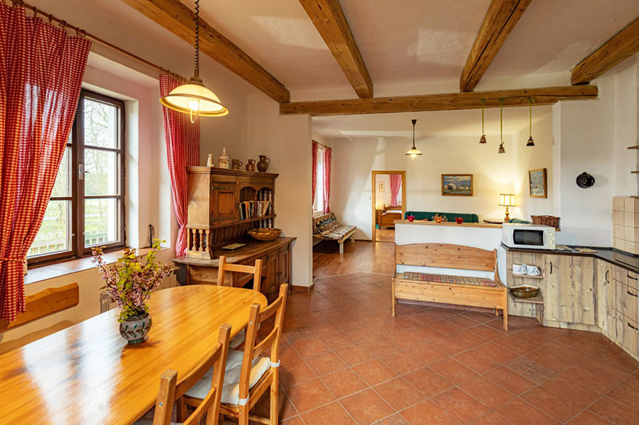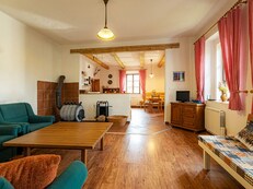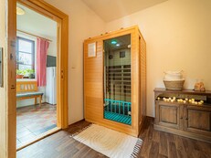V objektu: vstupní chodba (infra sauna pro 2 osoby), společenská místnost (TV, kamna, stůl, křesla, jednolůžková přistýlka, rozkládací gauč - 2x přistýlka) s kuchyňským a jídelním koutem (varná deska, lednice + mrazák, mikrovlnná trouba, rychlovarná konvice, univarzální kapslový kávovar, stůl, židle, lavice), třílůžková ložnice (dvoulůžko, samostatné lůžko), třílůžková ložnice (patrová postel - dole dvoulůžko, nahoře lůžko), koupelna (sprchový kout, umyvadlo, pračka), samostatné WC. K dispozici: dětská postýlka + židlička. Topení: tepelné čerpadlo, kamna ve společenské místnosti. Dětská postýlka zdarma na předchozí včasné vyžádání, schůdek do koupelny, nočník, dětská židlička.